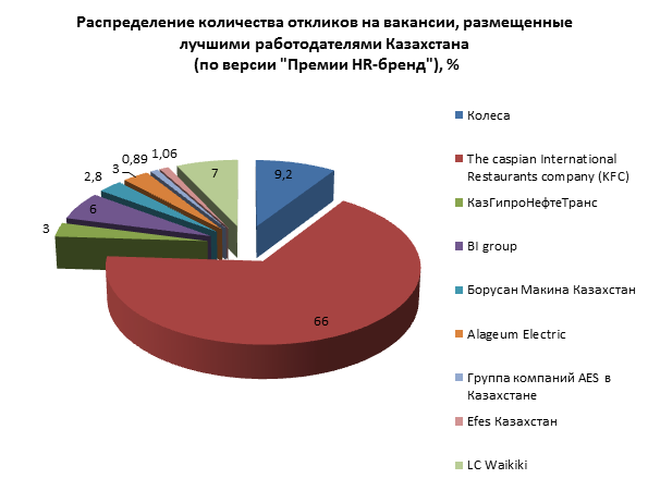 За исследуемый период каждое 80-е резюме, размещенное на сайте, было отправлено компаниям, удостоившимся призовых мест авторитетного казахстанского отраслевого конкурса в области управления персоналом – «Премия HR-бренд Казахстан 2015». Лучшие работодатели Казахстана выбираются ежегодно авторитетным жюри и базируются на результатах отбора наиболее успешных HR-практик компаний-номинантов. На соискание наград «Премии HR-бренд Казахстан» подаются проекты, реализованные в компании и показавшие результаты в развитии компании в целом и ее репутации как работодателя. Примечательно, что ок.66% всех откликов компаниям-лучшим работодателям года приходится на компанию The Caspian International Restaurants Company (c торговой маркой KFC), занявшей второе место в номинации «Столицы» конкурса. Остальное количество откликов распределилось следующим образом:
