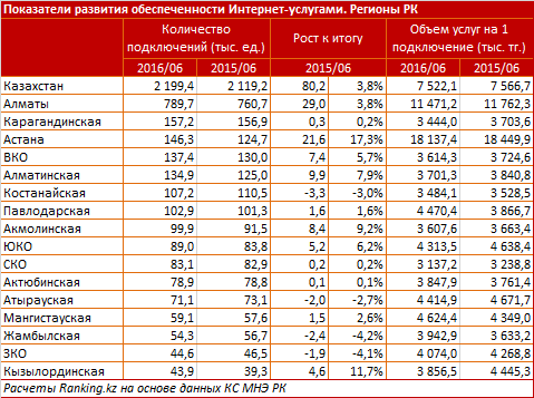 Объем фиксированных интернет-подключений по итогам июня 2016 года составил 2 199 тыс. единиц, увеличившись с начала года на 4,4%. Затраты предприятий и населения на получение услуг по доступу к Интернету в июне остановились на минимальном за год значении - 16 543 млн. тенге. К категории высокоскоростных относится 99,7% всех интернет-подключений.